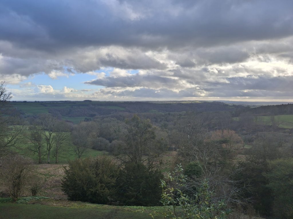 Newark Park ligt hoog boven het dal en biedt indrukwekkende uitzichten. Op heldere dagen kun je zelfs de Mendip Hills zien liggen, op zo’n 50 kilometer afstand. Het heeft iets bijzonders om hier in Gloucestershire te staan en zo ver over het landschap uit te kijken – velden die zich tot aan de horizon uitstrekken, heuvels en bomen die langzaam vervagen in het bleke winterlicht.